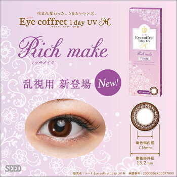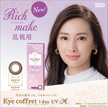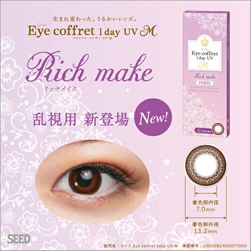 製品名:シード Eye coffret 1day UV M TORIC 承認番号:23000BZX00077000 カラー:Rich make (リッチメイク) レンズデザイン:ダブルスラブオフ (バックトーリック型) ベースカーブ:8.60mm 度数:±0.00D,-0.25D〜-6.00D(0.25Dステップ),-6.50D〜-8.00D(0.50Dステップ) 直径:14.2mm 中心厚:0.06mm(球面度数-3.00D,円柱度数-0.75D,円柱軸度180°の場合) 枚数:10枚入 保存液の主成分:アルギン酸配合 製造国:海外製他 輸入販売元:株式会社シード(日本法人) 商品の品質保証はこちらの法人が保証致します。